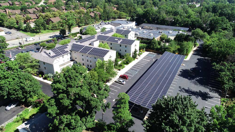 A custom solar system was engineered that combined multiple ballasted roof systems, penetrated roof systems, and two carports, meeting 99% of the hotel’s energy needs. The carport design also incorporated electric vehicle charging stations, creating an additional revenue stream for the hotel. To further promote the hotel’s environmental commitment, the marketing team provided a lobby monitor and in-room display cards.