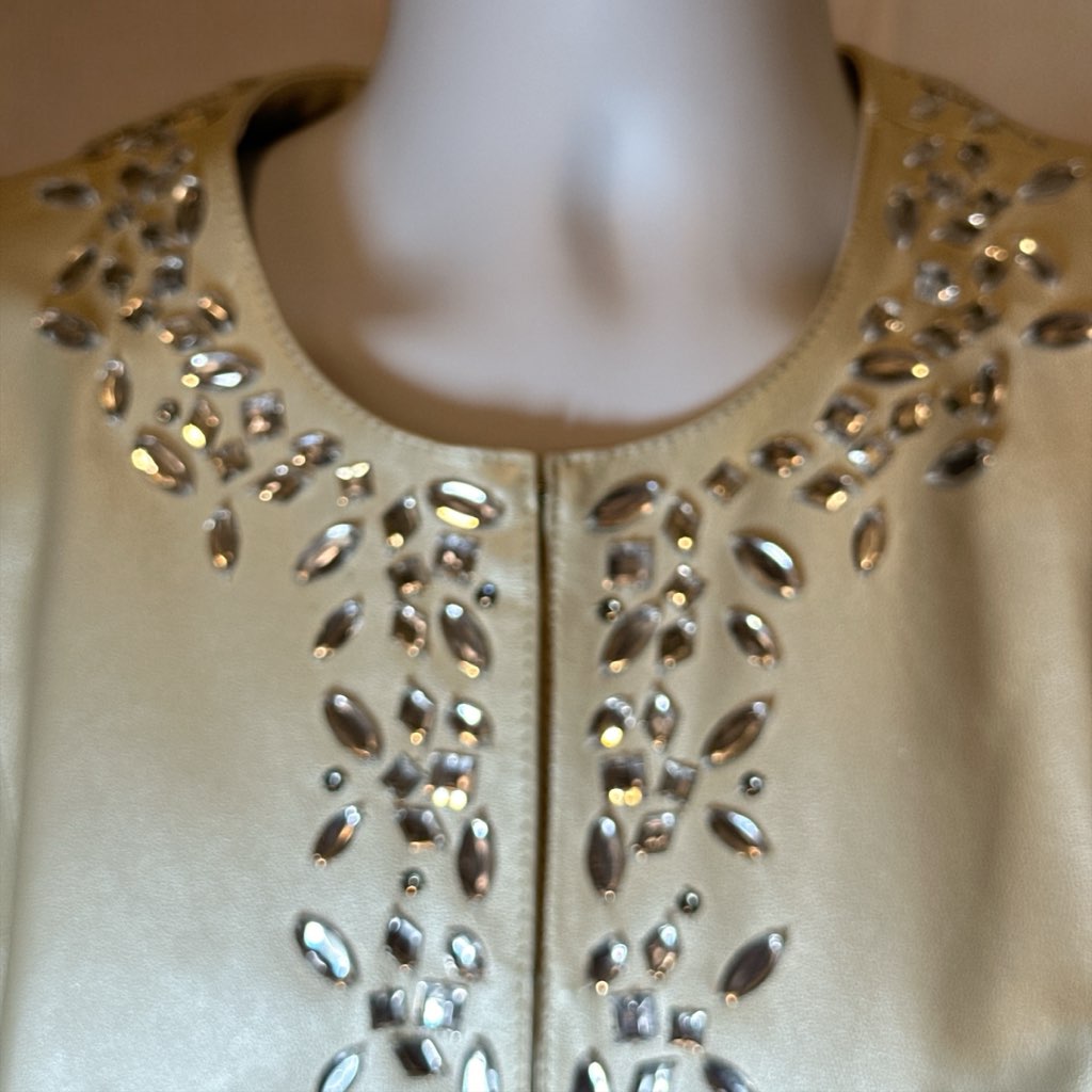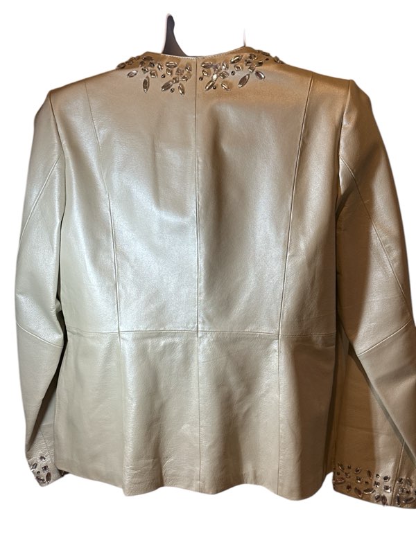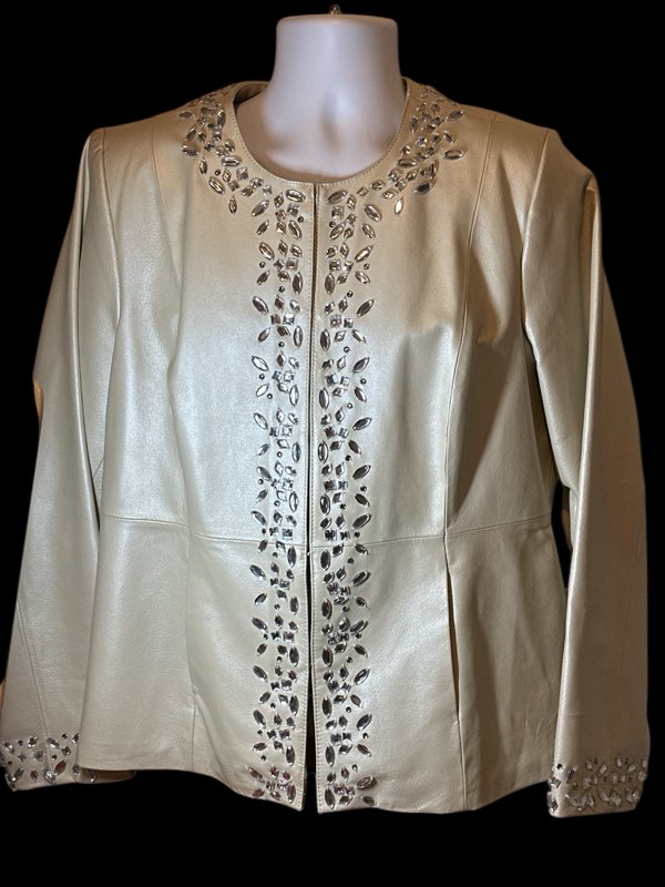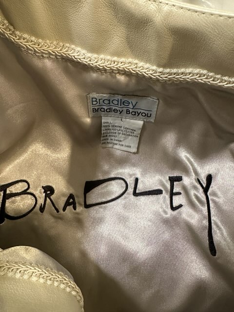 Vintage 90’s Bradly Bayou with winter white leather women’s Jacket different Rhinestones shapes along collar Wrists & down front Beautiful- + 100% leather. preowned like new. 2 hidden front pockets size large Monographed inside Bradly $98